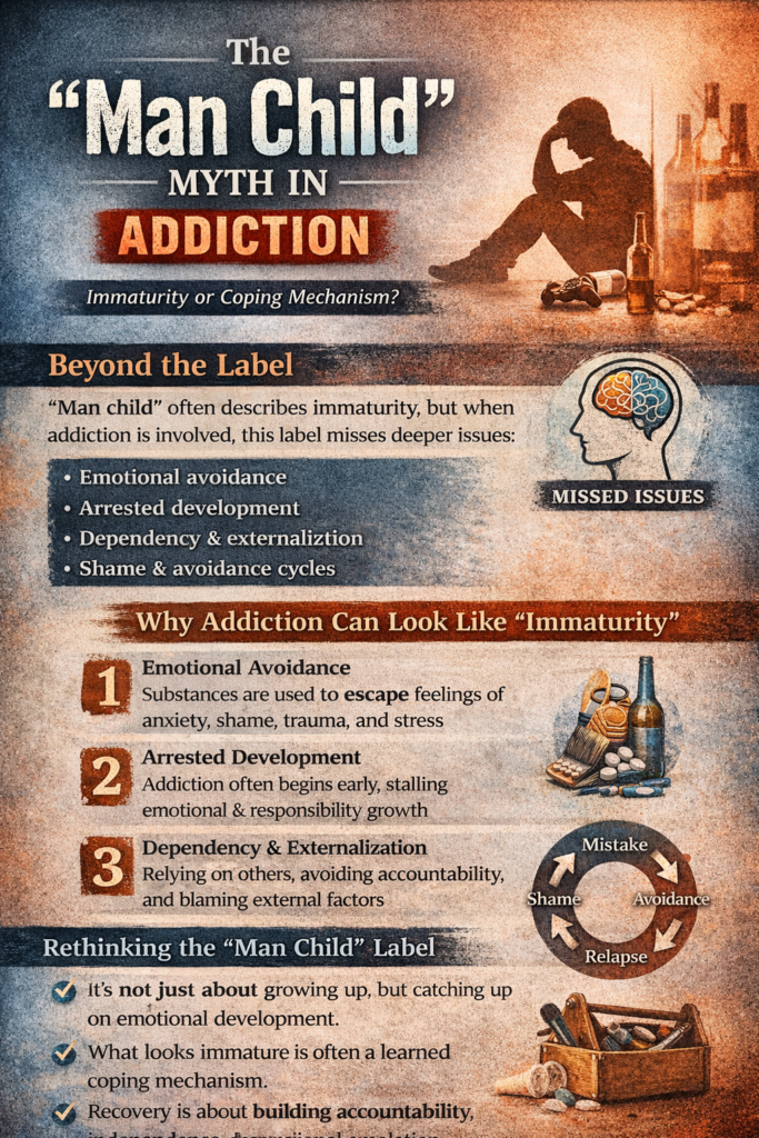 The term “man-child” is often used to describe an adult who appears emotionally immature, avoids responsibility, or depends on others. In addiction, these behaviors are usually not about refusal to grow up, but about coping deficits, emotional avoidance, and the impact of substance use on brain function.