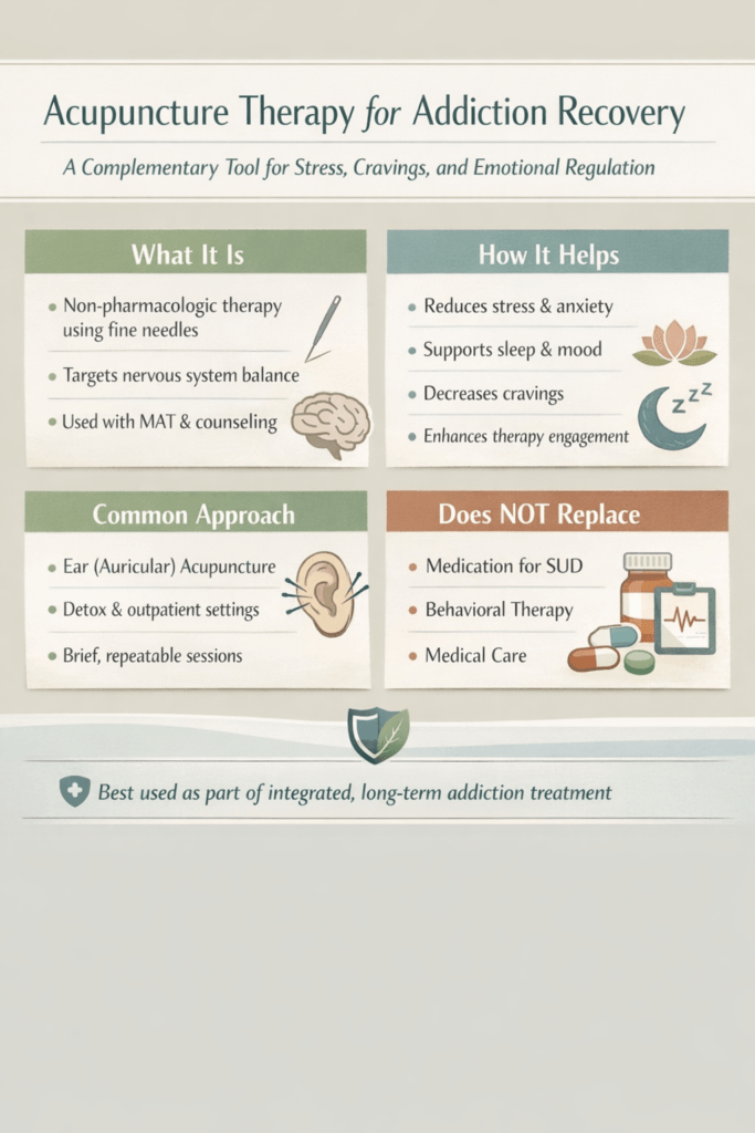 Acupuncture is not a cure for addiction, but evidence suggests it can reduce stress, withdrawal discomfort, anxiety, and cravings when used alongside standard treatments.