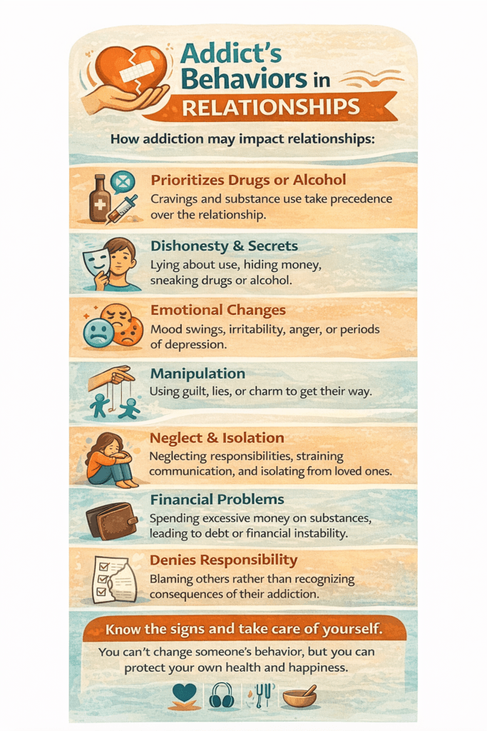 It’s important to remember that not everyone struggling with addiction will display all these behaviors, and each relationship is unique. However, these patterns serve as warning signs of a deeper issue that requires attention.