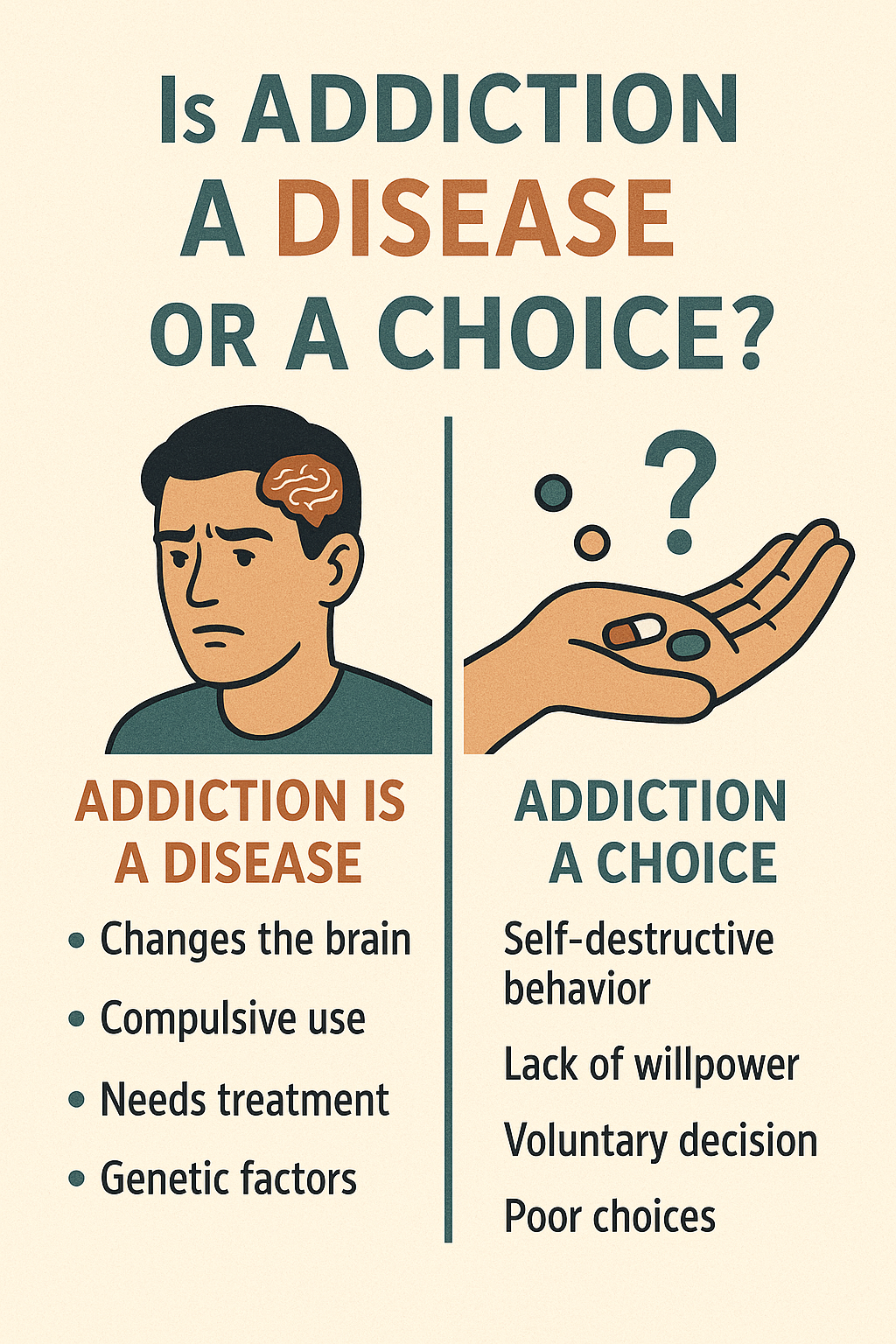 Both approaches offer valuable insights. The disease model emphasizes biological factors and advocates medical intervention, whereas the choice model emphasizes personal effort and accountability. Although neither view tells the complete story, each offers essential ideas that can help shape balanced, effective treatment plans. Your experiences and viewpoints may help you decide which perspective feels most accurate.
