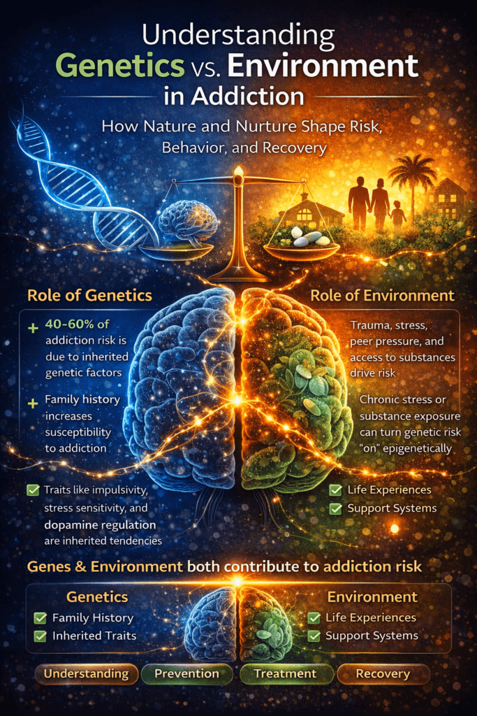 Addiction is best understood through the combined influence of genetics and environment rather than one or the other alone. Genetic factors can increase vulnerability by shaping how the brain responds to reward, stress, and impulse control, while environmental influences—such as trauma, family dynamics, social exposure, and access to substances—determine how that vulnerability is expressed. Understanding this interaction helps explain why addiction affects individuals differently and why risk is never fixed. It also shifts the conversation away from blame and toward informed prevention, treatment, and recovery.