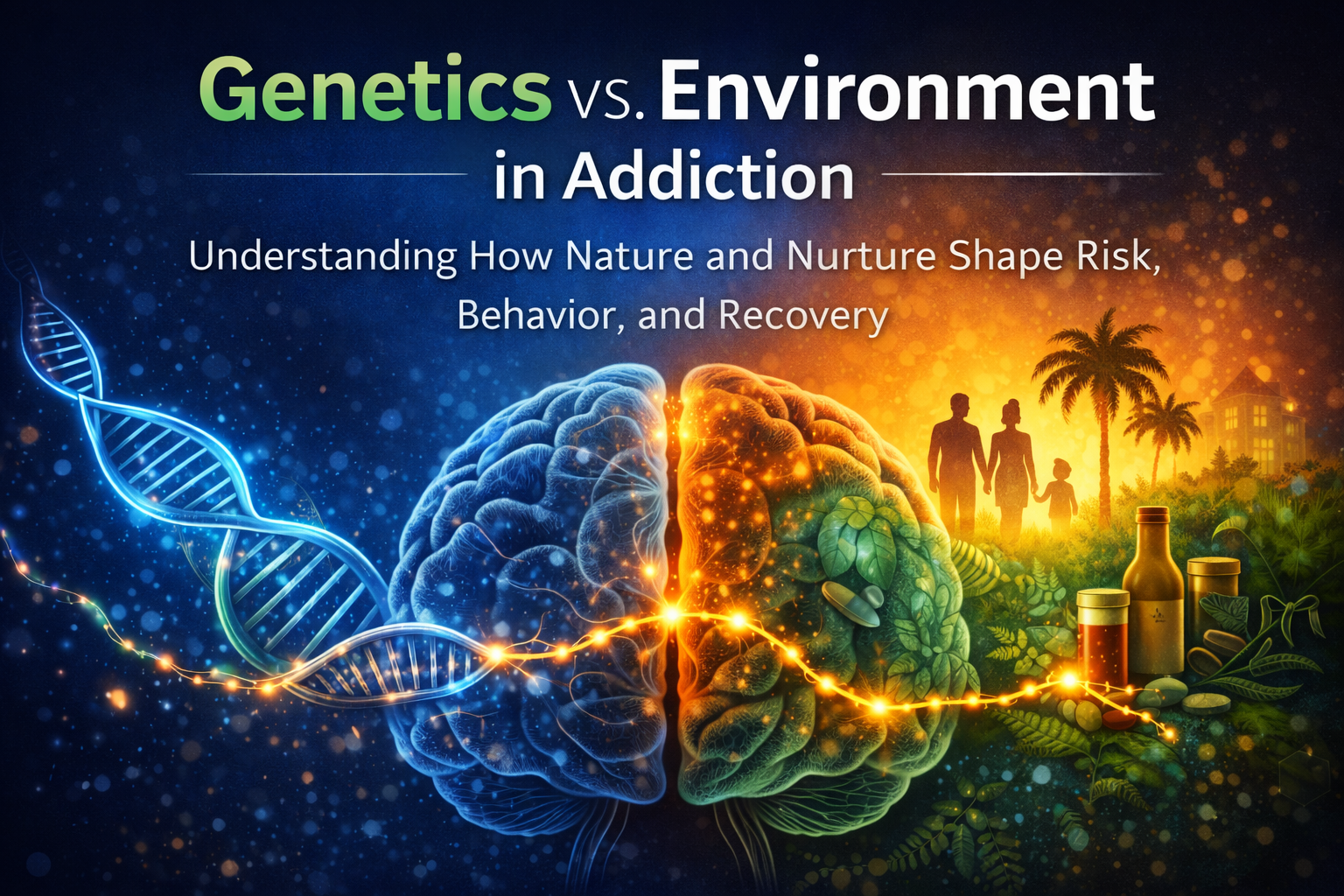 Addiction is best understood through the combined influence of genetics and environment rather than one or the other alone. Genetic factors can increase vulnerability by shaping how the brain responds to reward, stress, and impulse control, while environmental influences—such as trauma, family dynamics, social exposure, and access to substances—determine how that vulnerability is expressed. Understanding this interaction helps explain why addiction affects individuals differently and why risk is never fixed. It also shifts the conversation away from blame and toward informed prevention, treatment, and recovery.