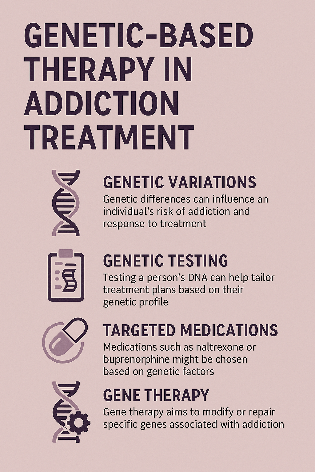 Genetic-based therapy for addiction offers a promising step toward personalized treatment by leveraging genetic insights to improve effectiveness, particularly in medication response. While it holds potential for tailored interventions, it also presents ethical concerns, privacy risks, and the challenge of balancing genetic factors with psychological and social influences. Although research continues to explore its full validity, genetic-based therapy is not yet a standalone solution but rather a complementary tool within a broader, holistic approach to addiction treatment.
