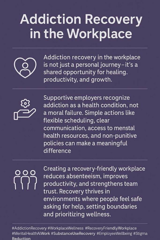 - Staff Training: Educate managers and employees on addiction and recovery to reduce stigma and promote empathy.
