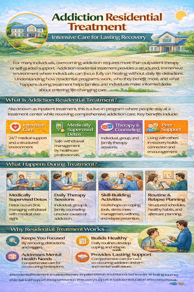 Residential treatment provides full-time structure, removal from triggers, continuous support, and intensive therapy.