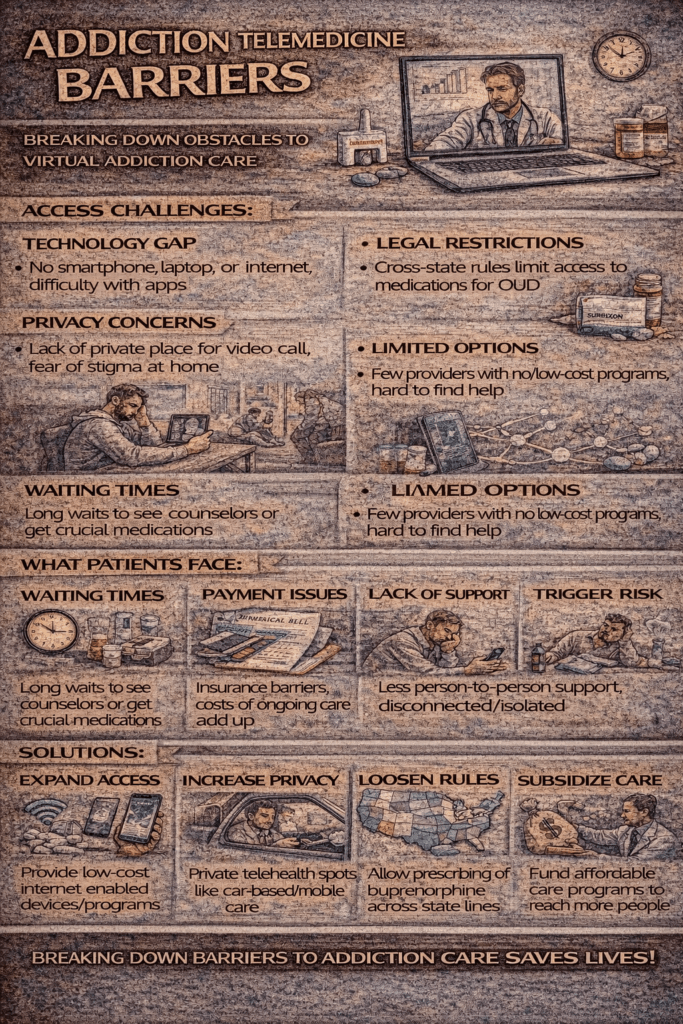 Telemedicine has emerged as a valuable tool for expanding access to addiction treatment, especially during and after the COVID-19 pandemic. It reduces travel burdens, improves access in underserved areas, and helps people connect with care more quickly. However, several barriers limit its effectiveness. These challenges fall into structural, technological, financial, and personal categories: