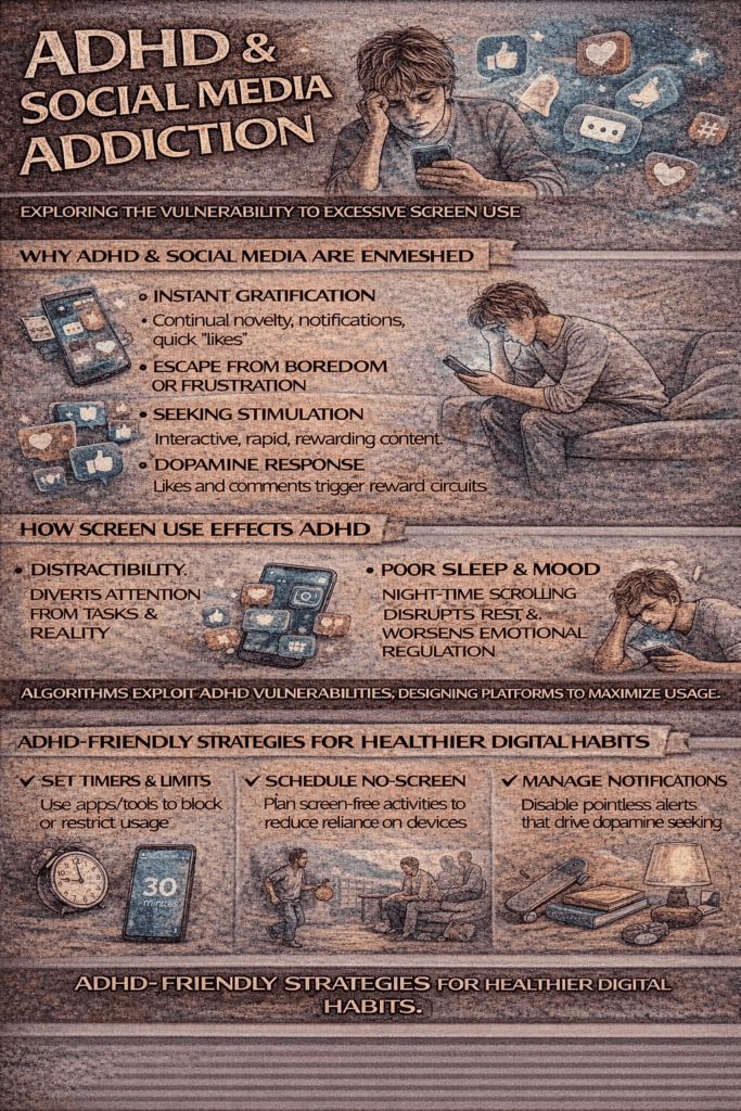 👉 In short: ADHD–Social Media Addiction isn’t an official disorder, but it captures how ADHD symptoms—impulsivity, reward-seeking, and inattention—interact with the highly stimulating design of social media, making individuals especially vulnerable to compulsive use.