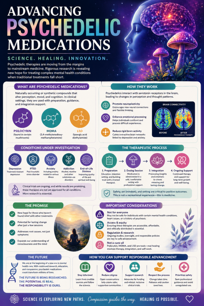 The advancement of psychedelic medications represents a significant and evolving frontier in modern medicine. While early findings are promising, continued progress depends on rigorous research, ethical oversight, and responsible clinical application. As understanding grows, these therapies may offer new pathways for individuals seeking relief from persistent mental health challenges. Ultimately, the future of psychedelic medicine lies in balancing innovation with caution—ensuring that emerging treatments are both effective and safe, while expanding access to care in a thoughtful and evidence-based way.