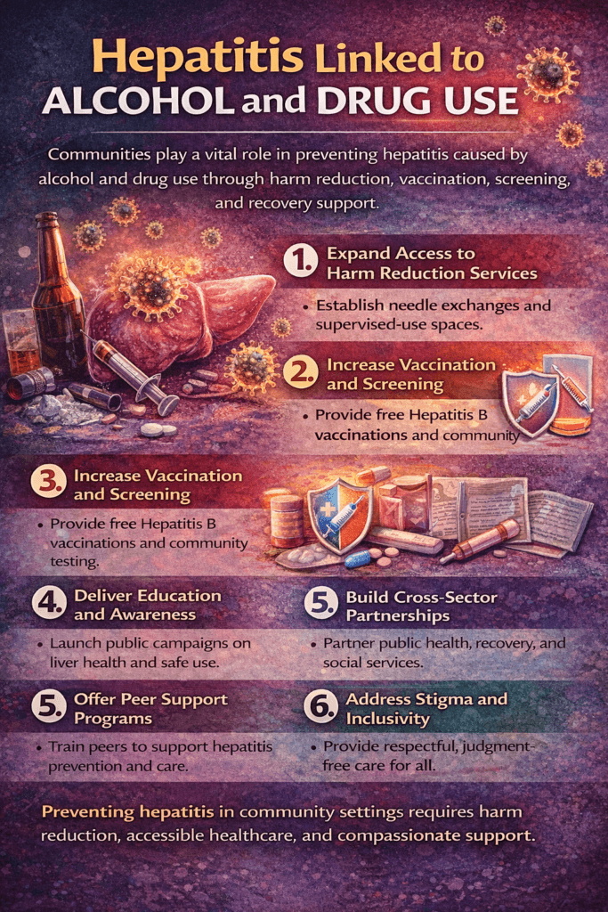 Hepatitis linked to alcohol and drug use remains a major public health concern, particularly among individuals facing substance use disorders. Excessive alcohol consumption accelerates liver damage, while unsafe drug-use practices—especially injection use—raise the risk of viral hepatitis transmission. Communities play a vital role in prevention by providing harm-reduction services, accessible healthcare, education, and integrated recovery support. When community systems work together, they form a bridge between prevention, early detection, and long-term healing.