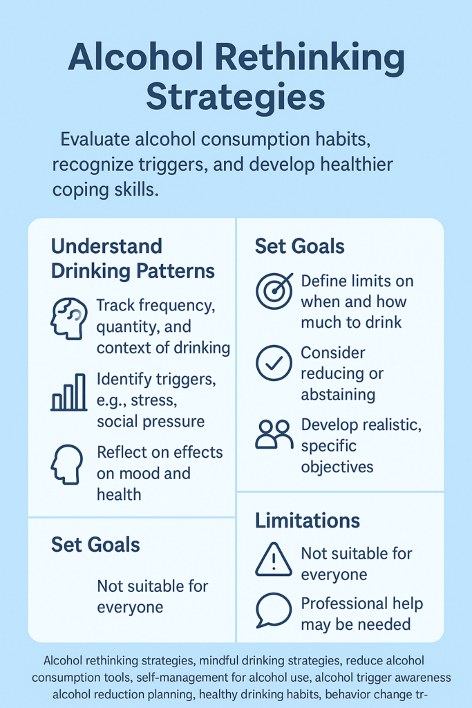 Rethinking strategies about drinking alcohol involves shifting perspectives and behaviors around alcohol consumption to promote healthier habits and reduce the risks associated with excessive or problematic drinking. These strategies can help individuals assess their relationship with alcohol, set limits, and make more informed decisions. Here are some effective strategies to consider: