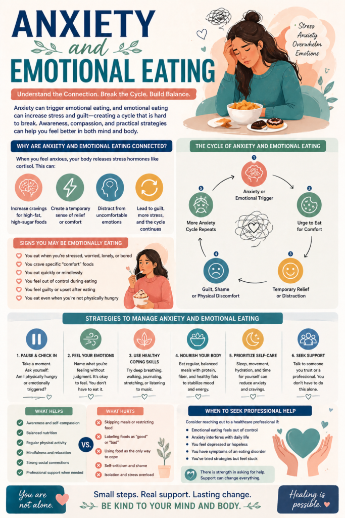 Anxiety and emotional eating are deeply connected, but they are not permanent patterns. With awareness, practical strategies, and self-compassion, it’s possible to move from reactive habits to intentional, balanced choices—creating a healthier relationship with both food and emotions.