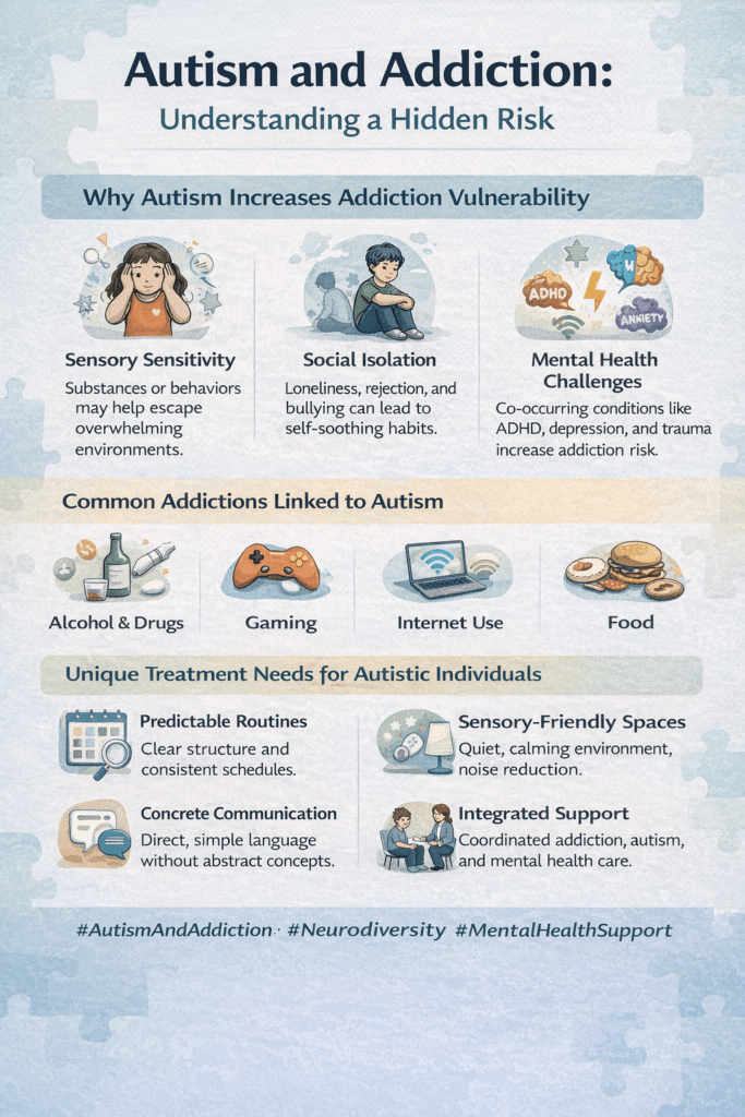 - Many autistic individuals already experience social rejection; addiction can deepen this.