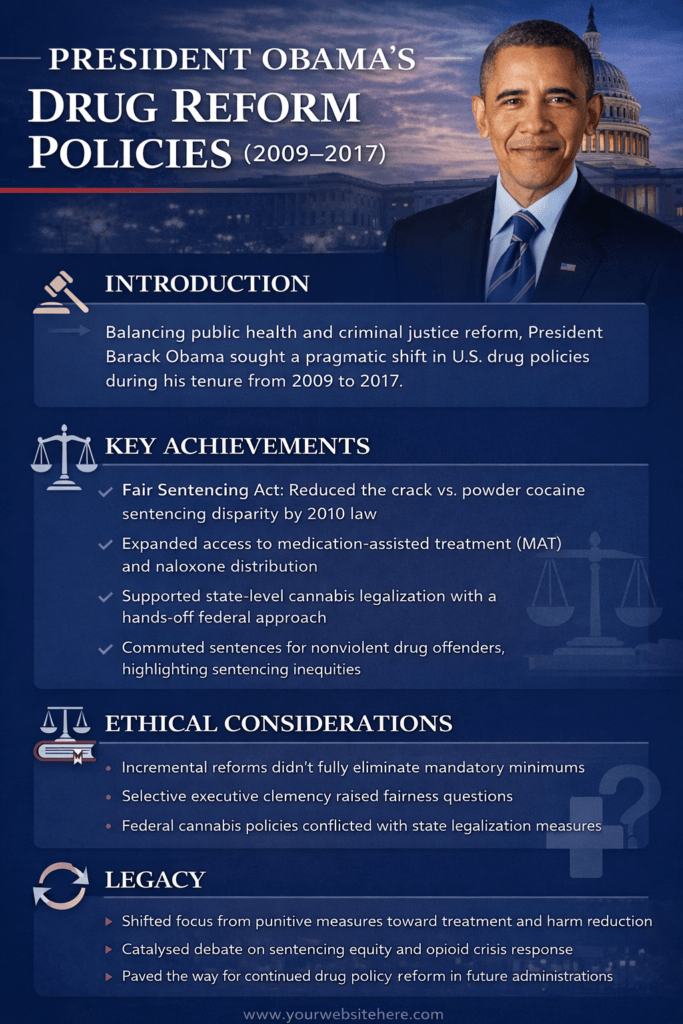 During his presidency (2009–2017), Barack Obama sought to rebalance U.S. drug policy by integrating public health principles with criminal justice reform. While these efforts reflected evolving addiction science and bipartisan reform movements, they also presented complex ethical dilemmas that remain relevant today.