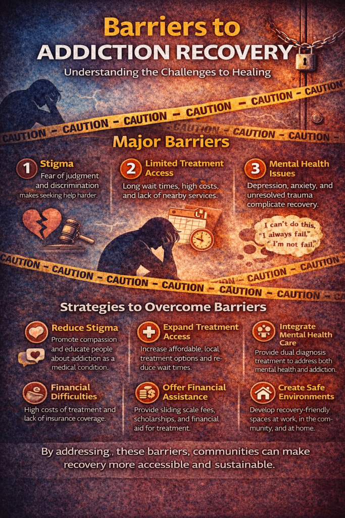 Recovery from addiction is a challenging and ongoing process that involves more than simply quitting substance use. Individuals often must rebuild their emotional health, relationships, daily routines, and sense of confidence. Although motivation and determination play an important role, many people face barriers that can make recovery more difficult. These obstacles may include emotional struggles such as anxiety, depression, or shame, as well as social stigma that discourages people from seeking help. Practical issues such as limited access to treatment, financial challenges, or transportation difficulties can also prevent individuals from receiving the support they need. Recognizing these barriers helps individuals, families, and communities better understand the challenges of recovery and work together to improve support systems and create environments that make recovery more possible and sustainable.