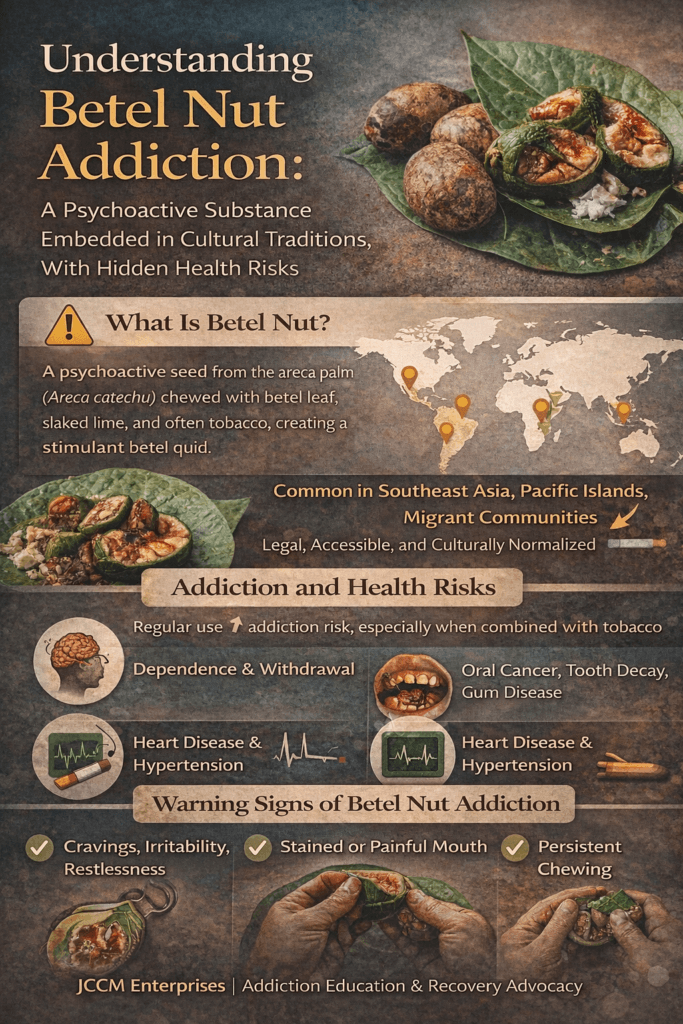 Betel nut may be culturally accepted, but it carries real addiction potential and serious health consequences. Awareness, early screening, and supportive cessation programs are key to prevention and recovery.