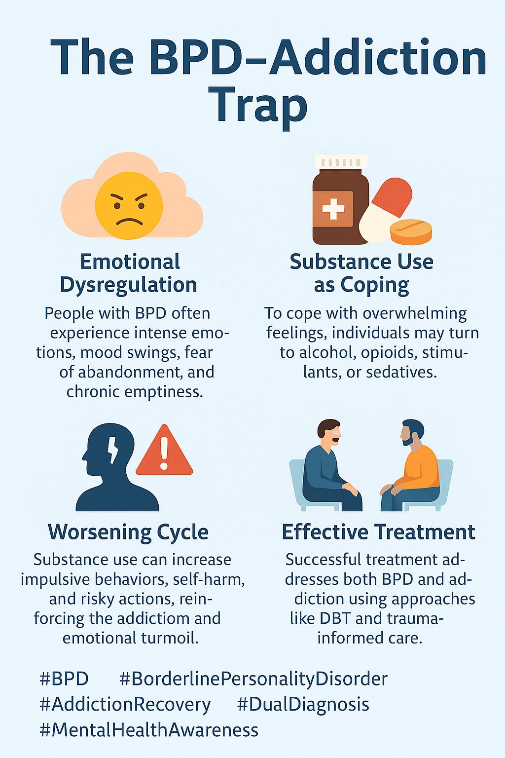 In summary, the emotional instability, impulsivity, chronic emptiness, and self-destructive tendencies common in BPD significantly increase the risk of addiction. While substances may offer temporary relief, they can worsen BPD symptoms and lead to dependency. Treating both BPD and addiction together through therapies like Dialectical Behavior Therapy (DBT) and support groups is essential for breaking the cycle and fostering long-term recovery. By addressing the root causes of both conditions, individuals can develop healthier coping mechanisms and achieve emotional stability without the need for substance use.