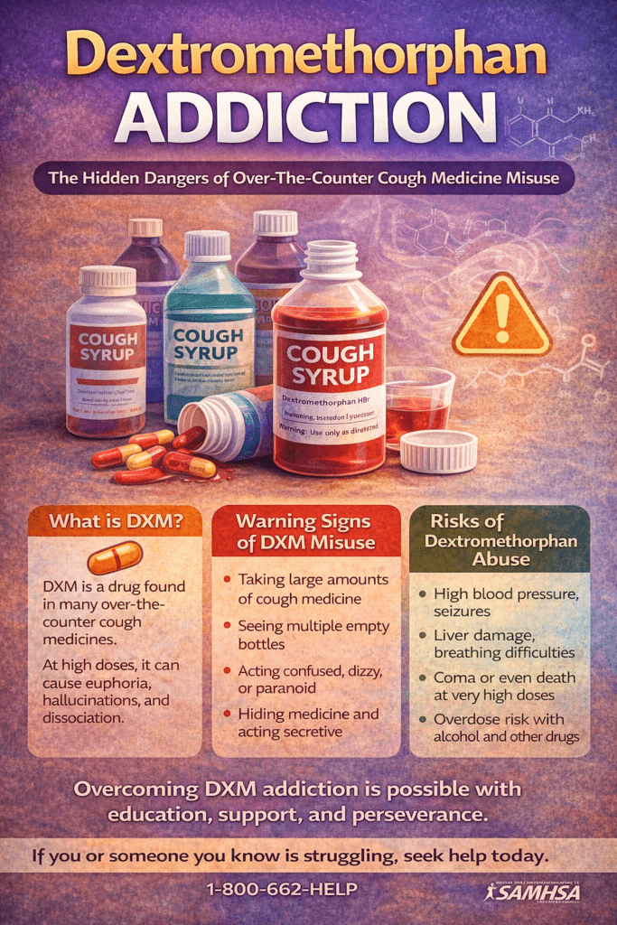 Dextromethorphan (DXM) addiction is a growing concern due to easy access to over-the-counter cough medicines. Although safe at recommended doses, high-dose DXM can cause mind-altering effects, dependence, and health problems. Recovery requires more than stopping use and relies on self-management, family support, and community resources working together to restore stability and long-term well-being.