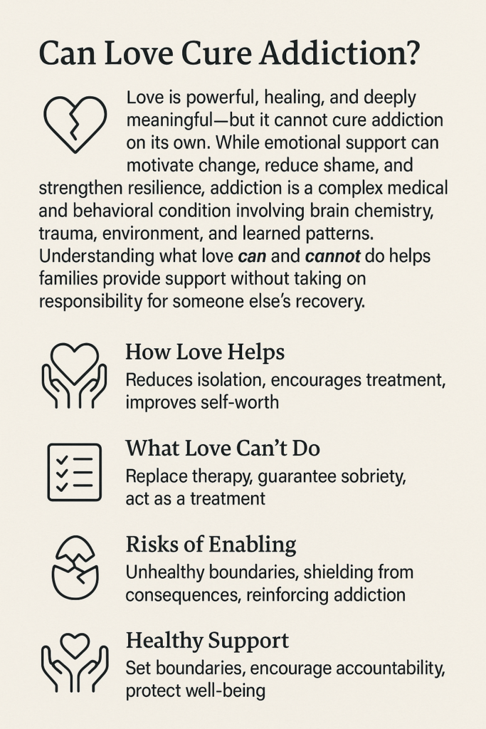 Medical professionals warn that while love can provide support, addiction recovery still demands treatment. Therapy, medication, support groups, and lifestyle changes all contribute. Love may inspire transformation and be a valuable part of someone’s story, but it doesn’t “cure” addiction in the magic way many may hope.