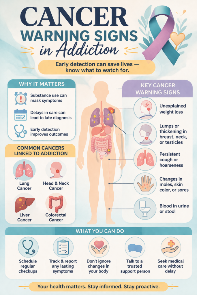 Cancer and addiction are not often discussed together, but in reality, they can be closely connected. For individuals struggling with substance use, recognizing potential warning signs of cancer is especially important. Symptoms may be overlooked, dismissed as side effects of drugs or alcohol, or ignored due to reluctance to seek medical care. Unfortunately, these delays can prevent early detection, when cancer is most treatable. Raising awareness of what to watch for can make a significant difference, helping individuals act sooner and improving the chances of better health outcomes.