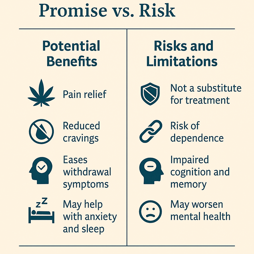 While cannabis, particularly CBD, has potential benefits for managing opioid addiction—including reducing withdrawal symptoms, cravings, and anxiety—it also carries risks. Cognitive impairment, mood instability, addiction potential, and interactions with other treatments must be carefully considered. More research is needed to fully understand the long-term safety and efficacy of cannabis in opioid addiction treatment. Individuals should consult healthcare professionals to determine the best approach for their recovery journey.