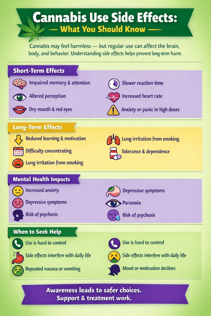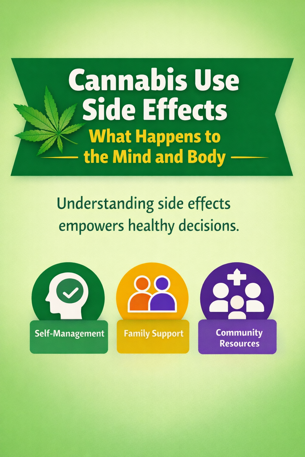 As cannabis use becomes more widely accepted, understanding its potential side effects is increasingly important. Although often viewed as low-risk, frequent or long-term use can cause physical, psychological, and behavioral effects such as memory impairment, anxiety, digestive issues, reduced motivation, and dependence. Managing these effects requires more than individual effort alone and is most effective when supported by self-management strategies, family involvement, and community resources that promote early intervention and healthier long-term outcomes.