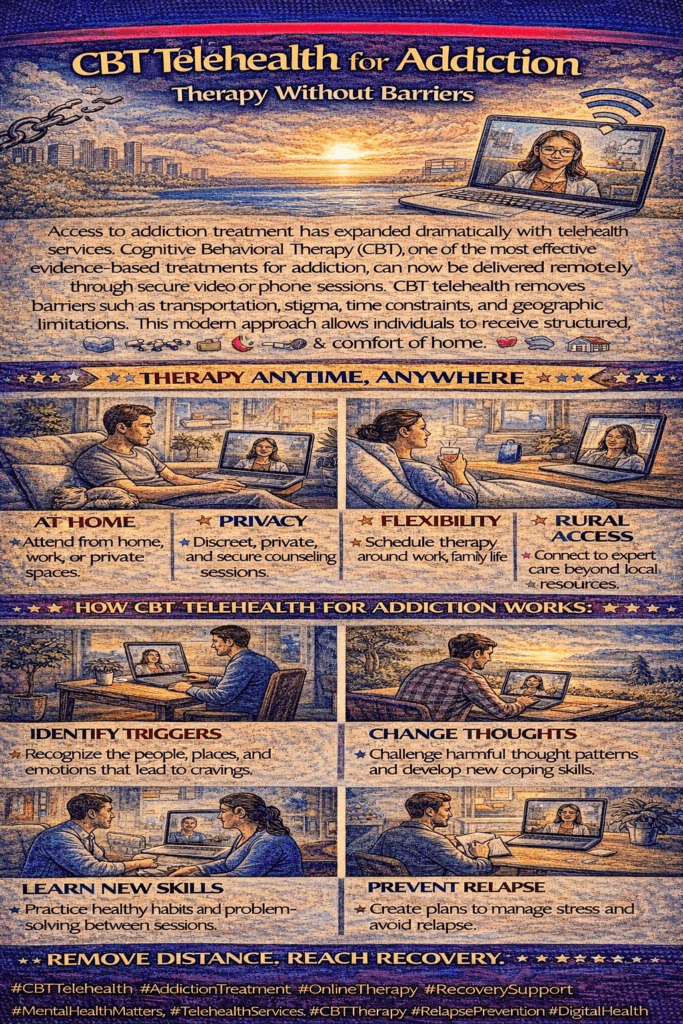 CBT telehealth provides Cognitive Behavioral Therapy for addiction through secure video or phone sessions instead of in-person office visits.