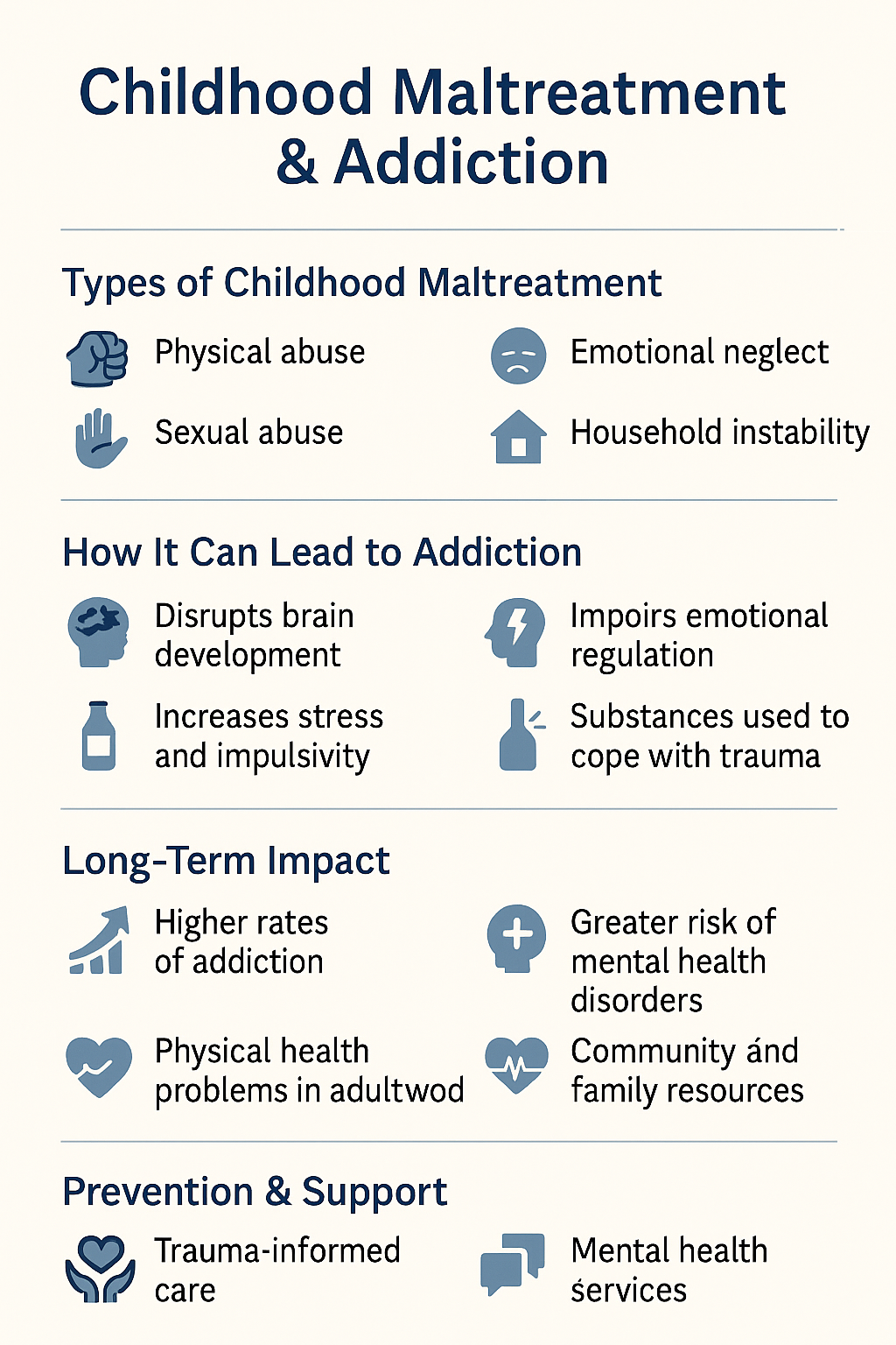 - Stigma Reduction Efforts: By addressing the stigma around both maltreatment and addiction, communities can create an environment that encourages open discussion and help-seeking without fear or shame.