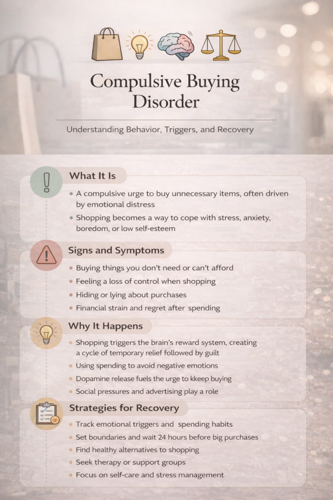 Compulsive Buying Disorder (CBD), sometimes referred to as oniomania, is a behavioral condition characterized by an overwhelming and repetitive urge to purchase items despite negative emotional, financial, or social consequences. While shopping is a normal and often necessary activity, CBD goes beyond routine consumption and becomes a maladaptive coping mechanism for managing stress, anxiety, loneliness, or low self-esteem. Individuals experiencing this disorder often find themselves caught in a cycle of anticipation, temporary relief, and subsequent guilt or regret. As consumer culture and online shopping continue to expand access and convenience, understanding the psychological, social, and neurobiological factors underlying compulsive buying has become increasingly important for promoting awareness, prevention, and effective intervention.