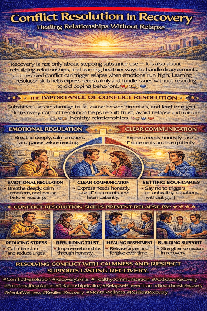 Unresolved conflict creates stress and emotional triggers that can increase the risk of relapse, so learning healthy resolution skills protects sobriety.