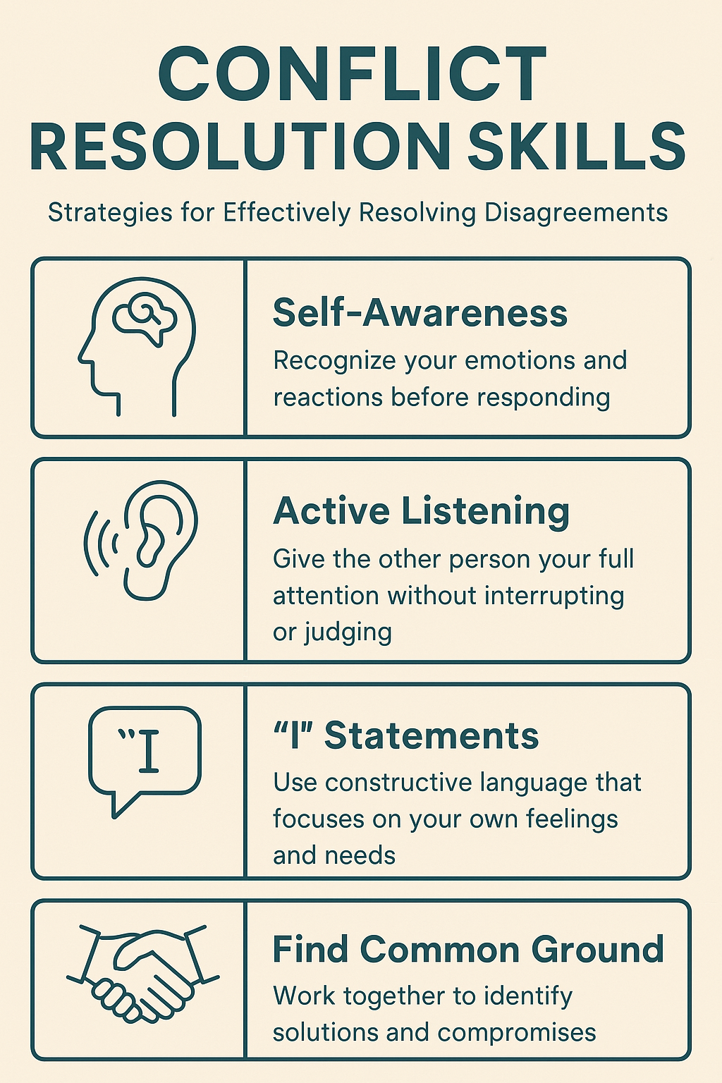 - Empathy Development: Try to see the situation from the other person’s viewpoint, even if you disagree. Empathy helps reduce the urge to react defensively, making it an essential step toward resolution.