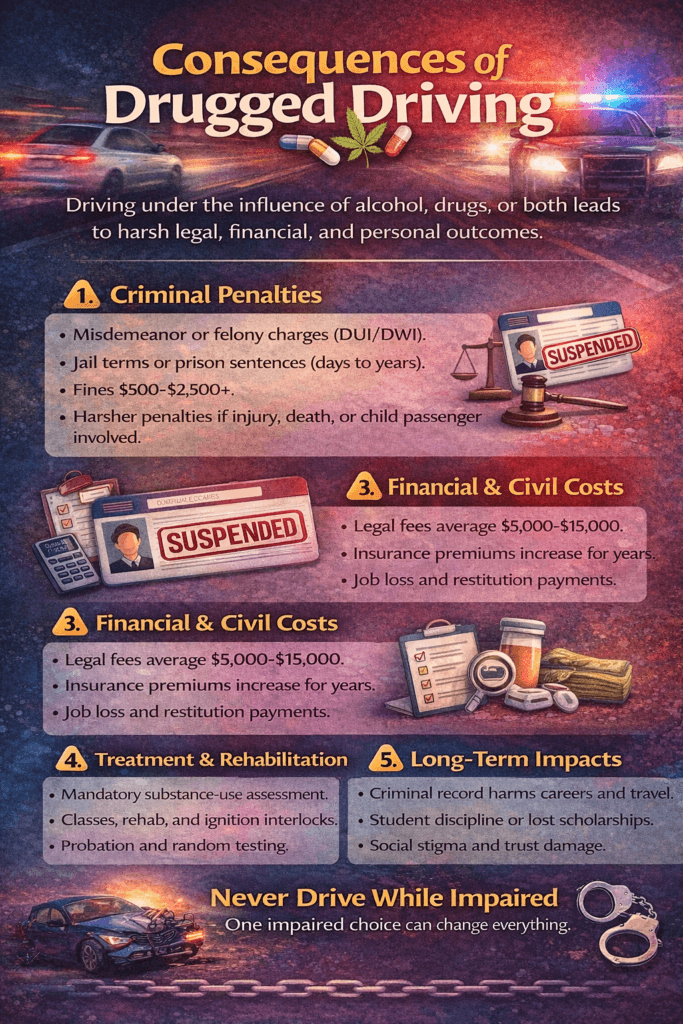 Driving under the influence of alcohol, drugs, or a combination of both carries serious legal, financial, and personal consequences. While penalties vary by state, substance type, and prior history, impaired-driving laws across the United States share one goal: protecting public safety by holding impaired drivers accountable. Understanding these consequences can help individuals make informed, life-saving decisions before getting behind the wheel.