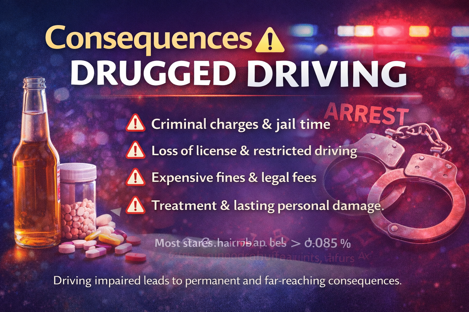Most states treat drugged driving the same as drunk driving. Laws prohibit driving under the influence of any impairing substance, not alcohol alone. Consequences may include: