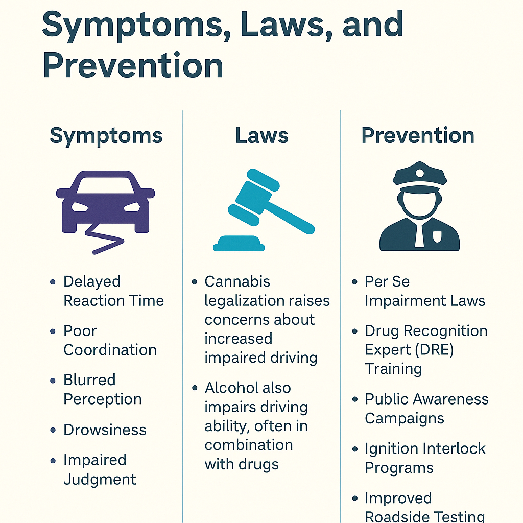 Drugged driving occurs when a driver operates a vehicle while impaired by drugs—whether illicit substances, prescription medications, or cannabis. Symptoms often include delayed reaction time, poor coordination, blurred perception, drowsiness, and impaired judgment, all of which drastically increase crash risk. With the legalization of cannabis in several U.S. states, law enforcement and health officials have observed growing concern about increased rates of impaired driving, especially when cannabis is mixed with alcohol or other substances. Both alcohol and drugs affect the central nervous system, altering perception and decision-making behind the wheel. In response, state governments have implemented measures such as stricter per-se impairment laws, Drug Recognition Expert (DRE) training, public awareness campaigns, ignition interlock programs, and improved roadside testing to detect impairment and prevent accidents.