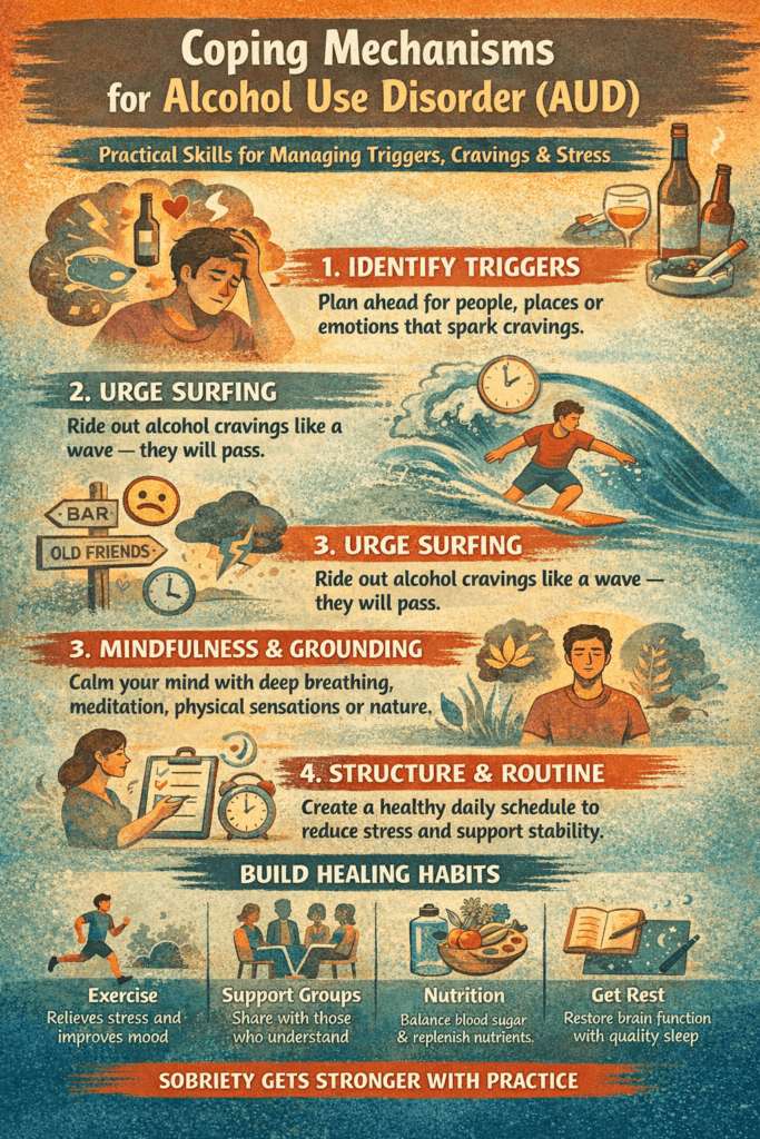 Coping mechanisms are tools and strategies that help manage cravings, stress, and emotional triggers without turning to alcohol.