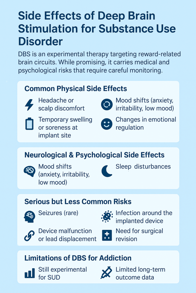 Deep brain stimulation (DBS) for substance use disorder (SUD) can lead to a variety of side effects, which may be physical, cognitive, emotional, or behavioral. The specific side effects often depend on factors like the targeted brain region, stimulation parameters, and individual patient differences. Here are some common and potential side effects associated with DBS: