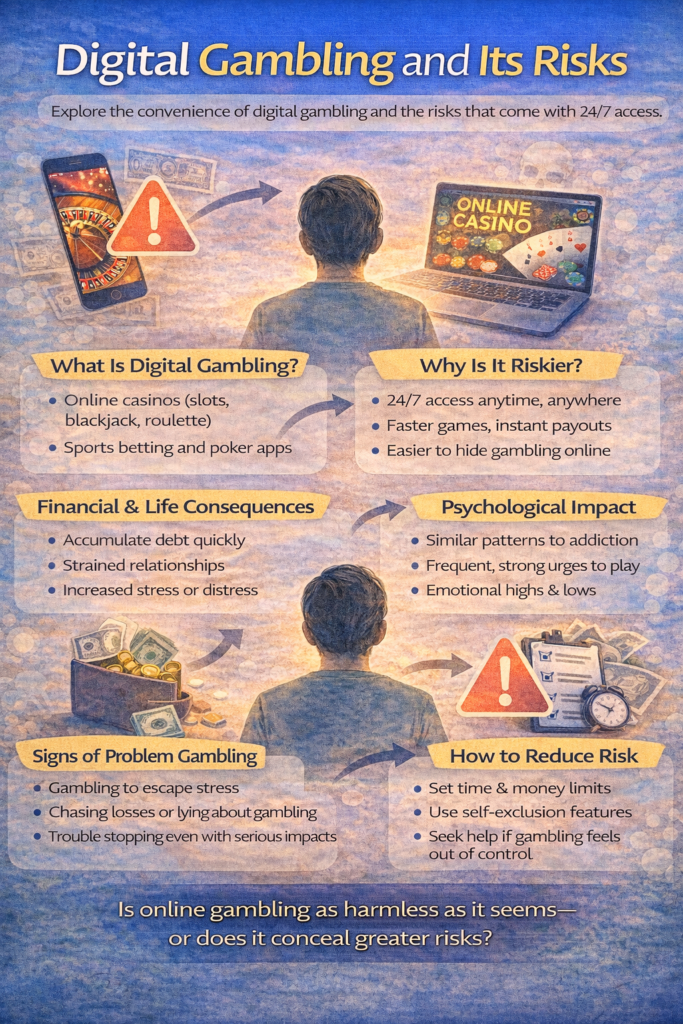 Digital gambling has rapidly expanded with the rise of smartphones, apps, and online platforms, making it easier than ever to place a bet at any time and from virtually anywhere. While it can appear to be a harmless form of entertainment, the constant accessibility, fast pace, and anonymity of digital gambling can increase the risk of problematic behavior. Many individuals may not immediately recognize how quickly casual use can shift into something more harmful. Understanding how digital gambling works—and the risks associated with it—is an important step in making informed, responsible decisions.