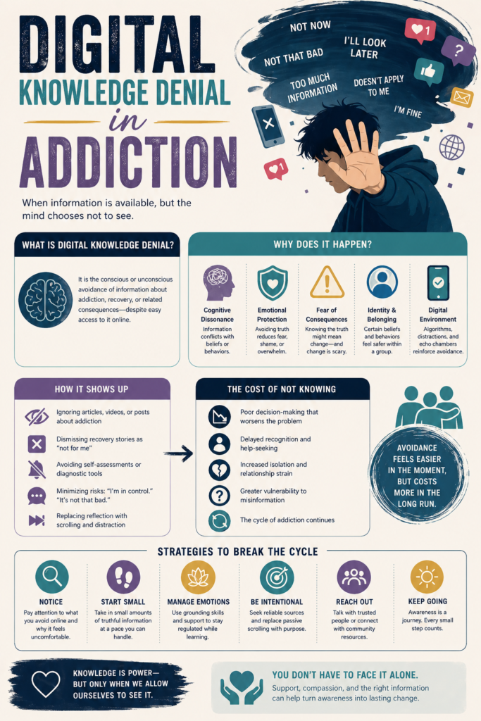 Digital knowledge denial in addiction highlights a critical paradox of modern life: the more accessible information becomes, the easier it can be to avoid it. This avoidance is not merely resistance, but often a coping mechanism shaped by fear, overwhelm, and the weight of potential change. Understanding this dynamic shifts the focus from simply providing more information to creating conditions where individuals feel safe enough to engage with it. Whether through personal awareness, family support, or community resources, addressing this form of denial requires patience, empathy, and intentional strategies. Ultimately, progress does not begin with knowing everything—it begins with the willingness to face even a small piece of the truth.