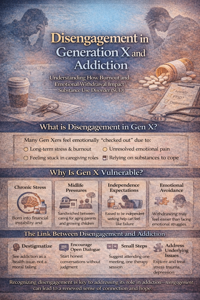 Disengagement in Generation X is an often-overlooked factor in understanding addiction and recovery. Individuals within this generation, now in midlife, frequently face cumulative stress from career demands, family responsibilities, and long-term societal pressures. These experiences can contribute to emotional withdrawal, reduced motivation, and a tendency to cope in isolation. In the context of Substance Use Disorder, this disengagement can make it more difficult to recognize the severity of the issue or seek appropriate help. Rather than being a sign of indifference, disengagement is often a complex response to burnout, unmet emotional needs, and prolonged stress.