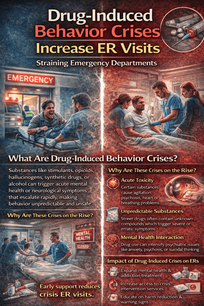 Drug-induced behavioral crises are a growing driver of emergency room (ER) visits worldwide. These crises occur when substances—such as stimulants, opioids, hallucinogens, synthetic drugs, or alcohol—trigger acute psychological or neurological reactions that impair judgment, perception, and emotional control. Individuals may present with severe agitation, paranoia, hallucinations, confusion, aggression, or sudden medical instability. Because these symptoms can escalate rapidly and unpredictably, emergency departments often become the first point of care.