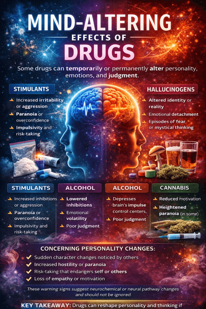 Certain substances don’t just affect mood or perception—they can temporarily or permanently alter personality traits, behavior patterns, emotional responses, and decision-making. These changes may include increased aggression, paranoia, impulsivity, emotional detachment, or even shifts in moral judgment. While some drugs produce short-term personality shifts during intoxication, others can create lasting psychological changes by altering brain chemistry, neural pathways, and emotional regulation systems. Understanding which substances can influence personality—and how they do it—helps individuals, families, and clinicians recognize warning signs early and intervene effectively.