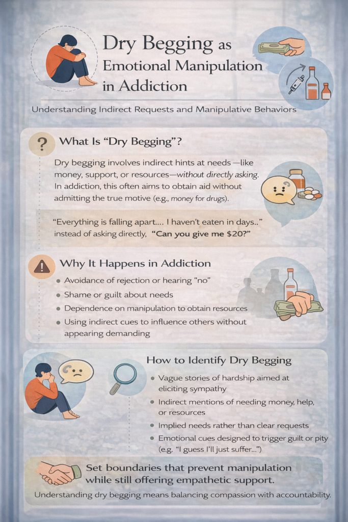 Dry begging as emotional manipulation in addiction highlights the intersection between unmet emotional needs and maladaptive communication patterns. Although it may stem from vulnerability and internal struggle, its indirect nature can create confusion, strain relationships, and contribute to enabling behaviors that sustain addiction. Addressing this pattern requires a balance of empathy and accountability—encouraging honest, direct communication while setting healthy boundaries. Through increased awareness, supportive interventions, and the development of clear communication skills, individuals and their support systems can move toward more transparent, respectful interactions that support long-term recovery and healthier relationships.