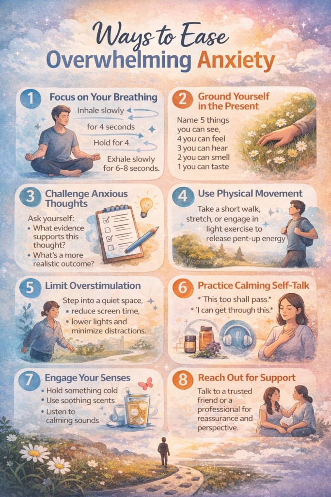 Easing overwhelming anxiety is not about eliminating it entirely, but about learning how to navigate it with greater awareness and confidence. Through techniques such as grounding, controlled breathing, and supportive thinking, individuals can reduce the intensity of anxious moments and regain a sense of stability. Over time, consistently applying these strategies builds resilience and strengthens the ability to cope with stress. Anxiety may still arise, but it no longer has to feel unmanageable. With the right tools and practice, it becomes something that can be understood, approached, and eased—one moment at a time.