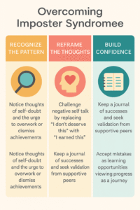 Professional Guidance: If imposter feelings overwhelm work and life, talking with a counselor or therapist can help. They offer personalized support and coping tools.