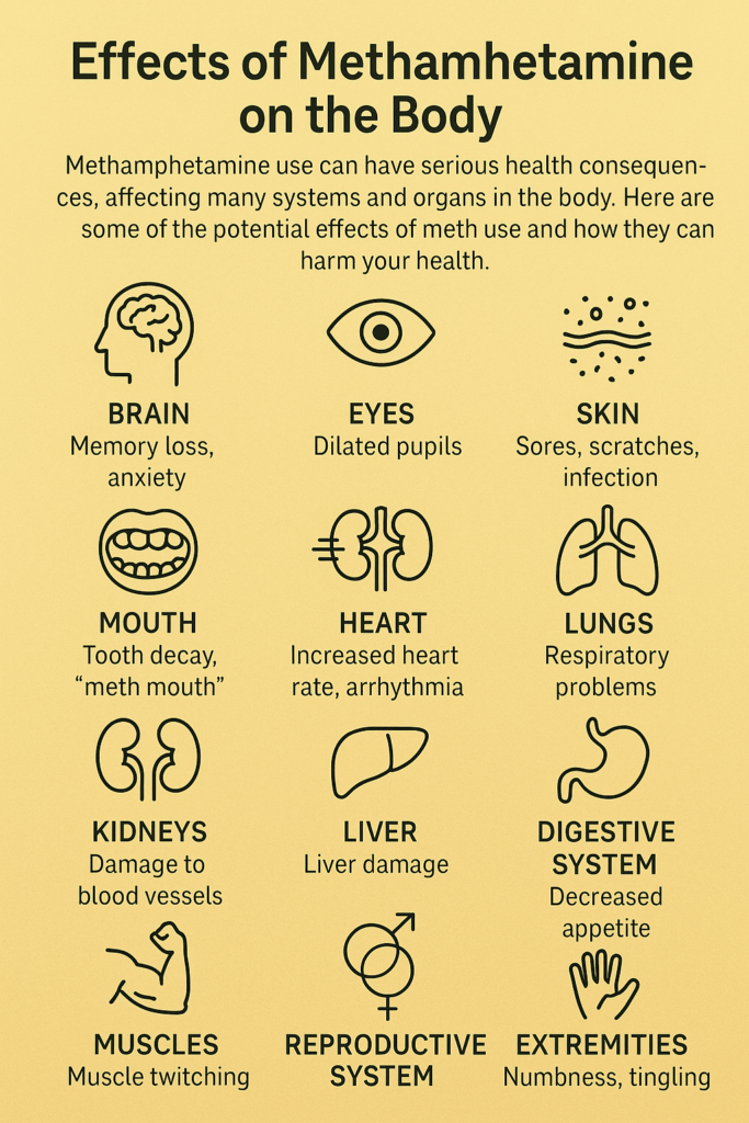 - Heart and Blood Vessels: Meth speeds up the heart rate and raises blood pressure. Over time, this strains the heart muscle, stiffens the arteries, and increases the risk of heart attack, stroke, or dangerous irregular heartbeats.