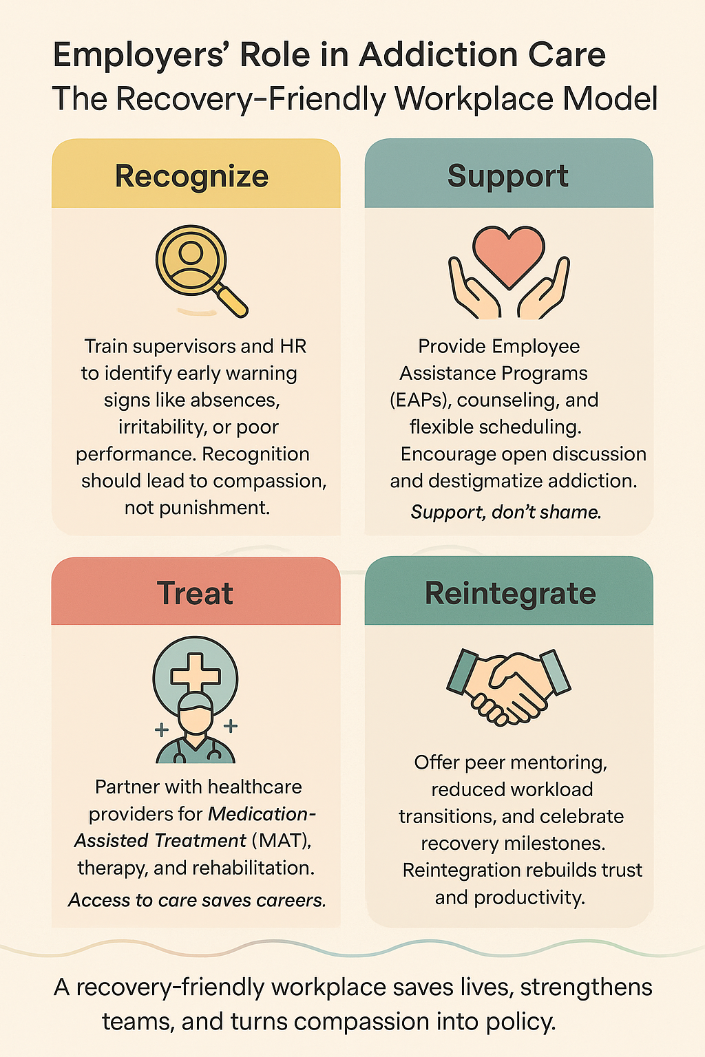 Employers play a crucial role in supporting addiction care and recovery for their workforce. Their involvement can significantly impact prevention, early intervention, and sustained recovery. Key roles of employers include:
