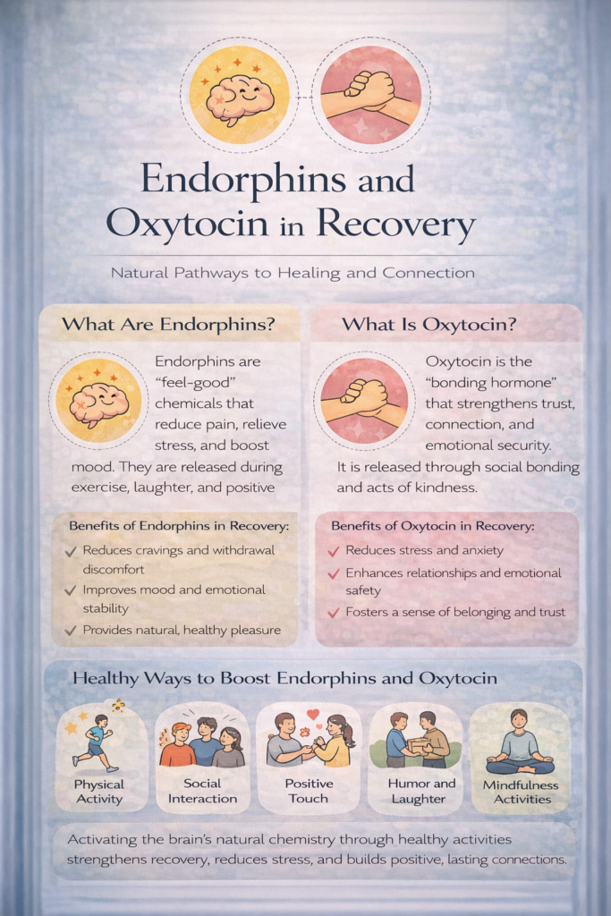 Recovery is not only about avoiding substances—it’s about retraining the brain to experience reward, relief, and connection naturally. Two key chemicals involved in this process are endorphins (natural pain relievers and mood boosters) and oxytocin (the bonding and trust hormone).