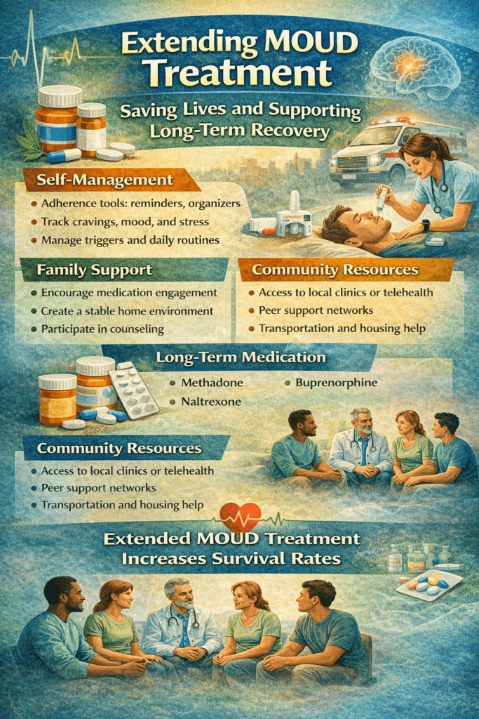 Extended MOUD treatment saves lives, but its full benefits are realized when combined with daily self-management practices, compassionate family support, and accessible community services. Self-management builds consistency and personal responsibility, families provide emotional stability and encouragement, and community resources remove barriers to ongoing care. When these elements work together, individuals are more likely to remain in treatment, avoid relapse, and achieve lasting recovery. As addiction care continues to evolve, integrating extended medication treatment with supportive personal and social strategies offers the strongest foundation for survival, healing, and long-term wellness in opioid use disorder.