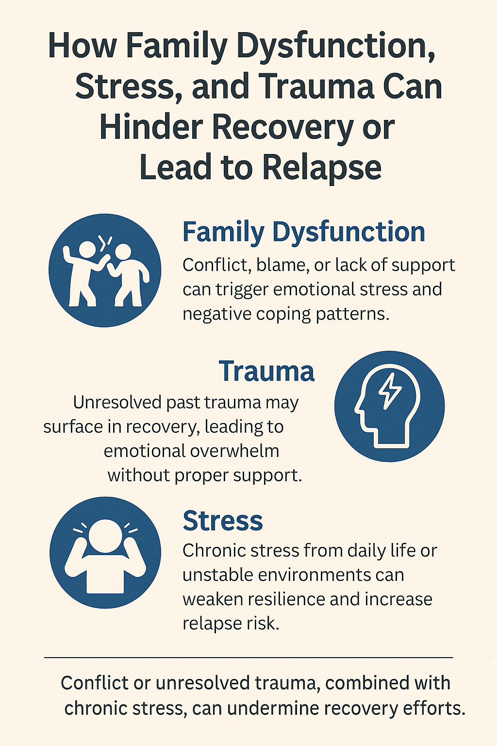 - Poor communication, unresolved trauma, or chronic conflict may act as emotional triggers that destabilize recovery.