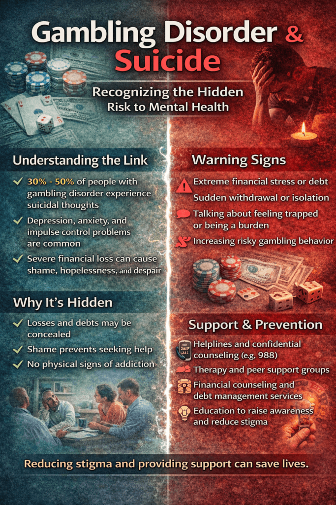 Gambling disorder is a serious behavioral addiction that can profoundly affect emotional well-being, finances, and relationships. Over time, mounting debt, secrecy, guilt, and social isolation can create intense psychological distress. When these pressures combine with depression, anxiety, or impulsivity, individuals may begin to feel trapped and hopeless—states strongly associated with suicidal thoughts. Understanding how gambling disorder can lead to suicide is essential for recognizing warning signs early, reducing stigma, and encouraging timely intervention. Awareness allows families, clinicians, and communities to respond with empathy and support rather than judgment.