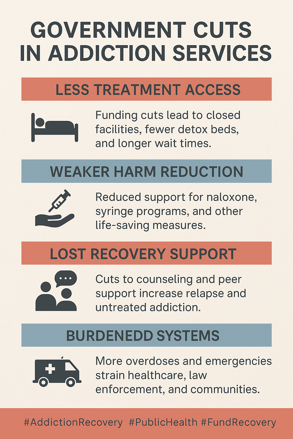 Government funding cuts put essential addiction treatment, harm reduction, and recovery supports at risk—forcing closures, staff layoffs, and reduced access in vulnerable communities. Maintaining funding is critical to preserving recent gains in reducing overdoses and supporting long-term recovery.